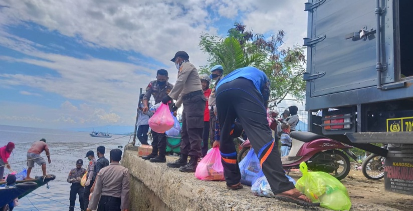 Aksi kemanusian kali ini menyasar pulau karampuang, ratusan paket sembako nampak disalurkan oleh personil Polda Sulbar dengan menggunakan kapal laut atau perahu.