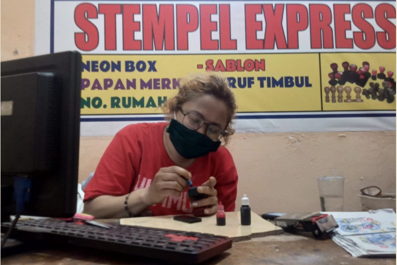 Karena kata Jein bahwa pekerjaannya membuat stempel sangat beresiko karena pelanggannya juga tidak bisa dipastikan bahwa mereka steril dari penyebaran korona.