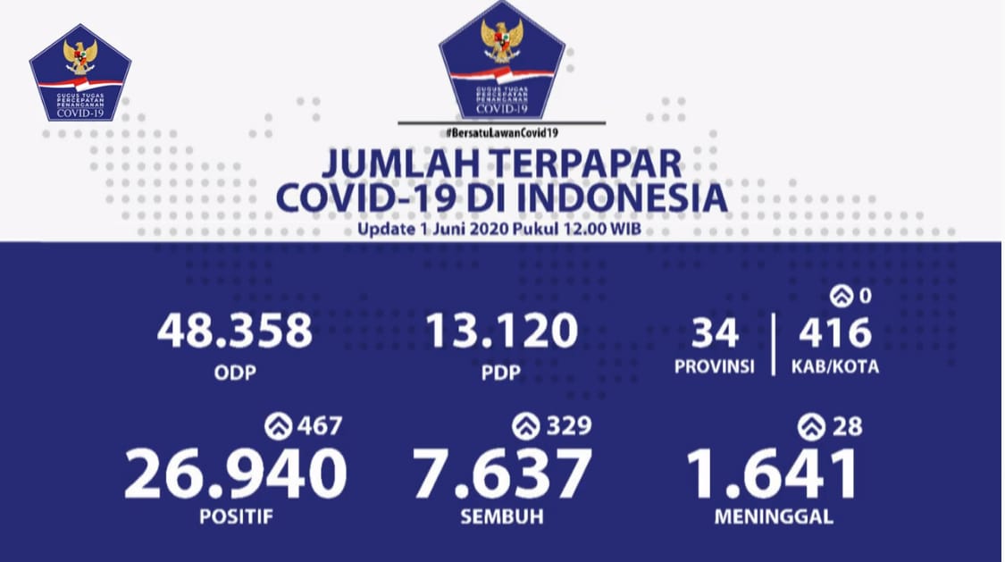 Secara rinci, spesimen yang diperiksa hingga hari ini sebanyak 333.415 dengan hasil konfirmasi positif Covid-19 bertambah 467 total 26.940. Pasien sembuh bertambah 329 total 7.637, sementara pasien meninggal bertambah 28 total 1.641.