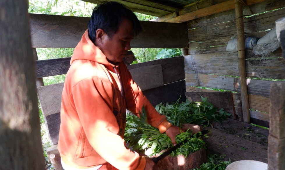Azar terlihat memberi pakan ternak yang ia buat sendiri.”Babi dikasih makan daun ubi jalar, Konga, campur nasi dengan air”, lanjutnya.