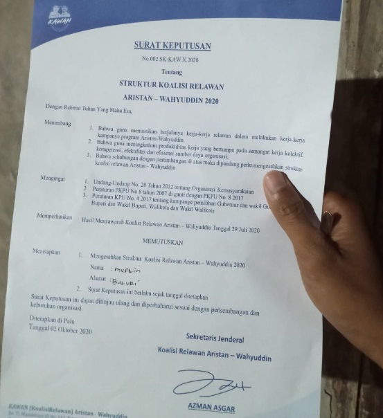 PALU – Celebesta.com, Beberapa hari terakhir, tim Koalisi Relawan Aristan-Wahyudin bekerja hingga di akar rumput. Terlihat di rumah-rumah warga di dominasi poster calon walikota palu nomor urut satu itu. Selain poster adapula yang merekrut dengan mengisi Surat Keputusan Relawan Aristan-Wahyudin.