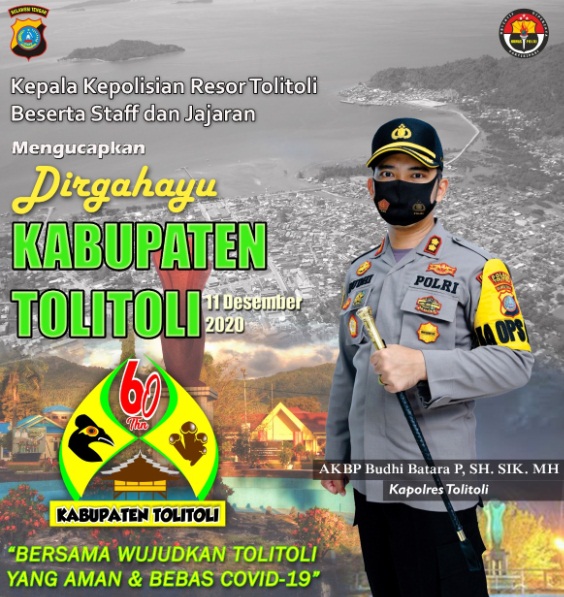 Ucapan selamat tersebut diungkapkan melalui meme atau kartu ucapan yang di upload media sosial Polres Tolitoli, “Kepala Kepolisian Resor Tolitoli beserta staf dan jajaran mengucapkan Dirgahayu Kabupaten Tolitoli ke-60” demikian tertulis.