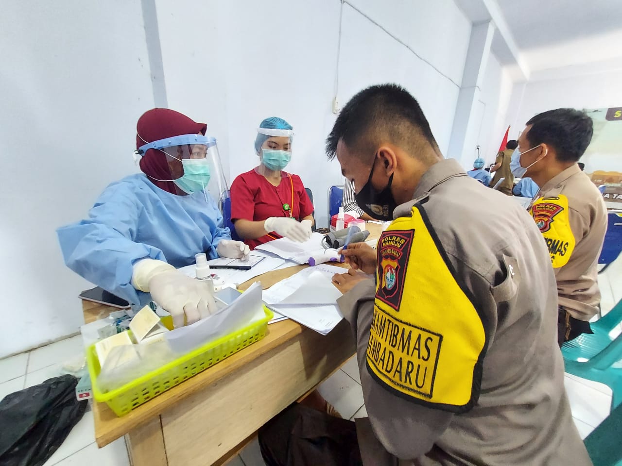 Kegiatan vaksinasi ini juga diikuti oleh para pejabat utama Polres Mateng, para Kabag, Kasat, dan Kasi. Penyuntikan dilakukan secara bergiliran dan dibagi ke dalam beberapa sesi agar tidak terjadi kerumunan.