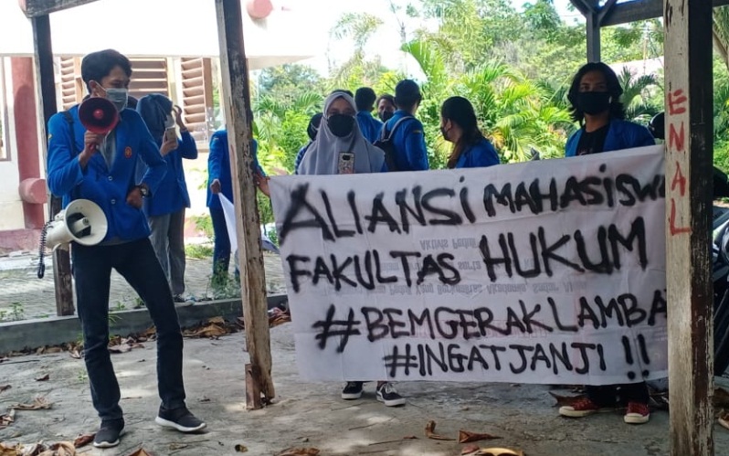 Moh. Raymawan selaku Koordinator Lapangan (Korlap) sampaikan tuntutan kepada pihak BEM FH Untad mengawal sampai tuntas kebijakan UKT semester ganjil dan menuntut pihak birokrasi memberikan bantuan kuota untuk mahasiswa.