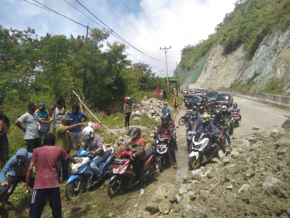 Setelah hampir selama 3 jam jalan putus total akibat longsor, jalur kebun kopi kini sudah bisa dilalui pengendara.