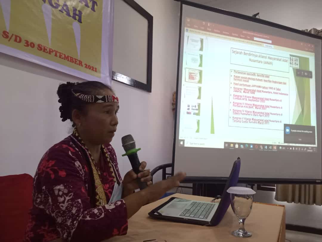 Kali ini, Rukmini diberi kesempatan menyampaikan materi peran perempuan dalam gerakan masyarakat adat di pelatihan kader masyarakat adat.