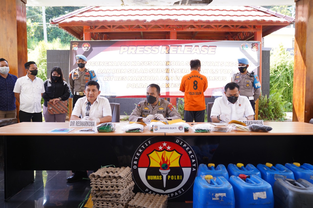 Pada press release yang di terima celebesta.com, Rabu (13/04/22) Direktorat Reskrimus selain berhasil mengamankan barang bukti 6.2 Ton BBM jenis Solar di Kecamatan Kalukku, juga berhasil mengamankan satu orang pelaku. Sementara Direktorat Res Narkoba berhasil mengamankan 2 pelaku penyalagunaan Narkoba juga barang bukti berupa 5 KG shabu-shabu.