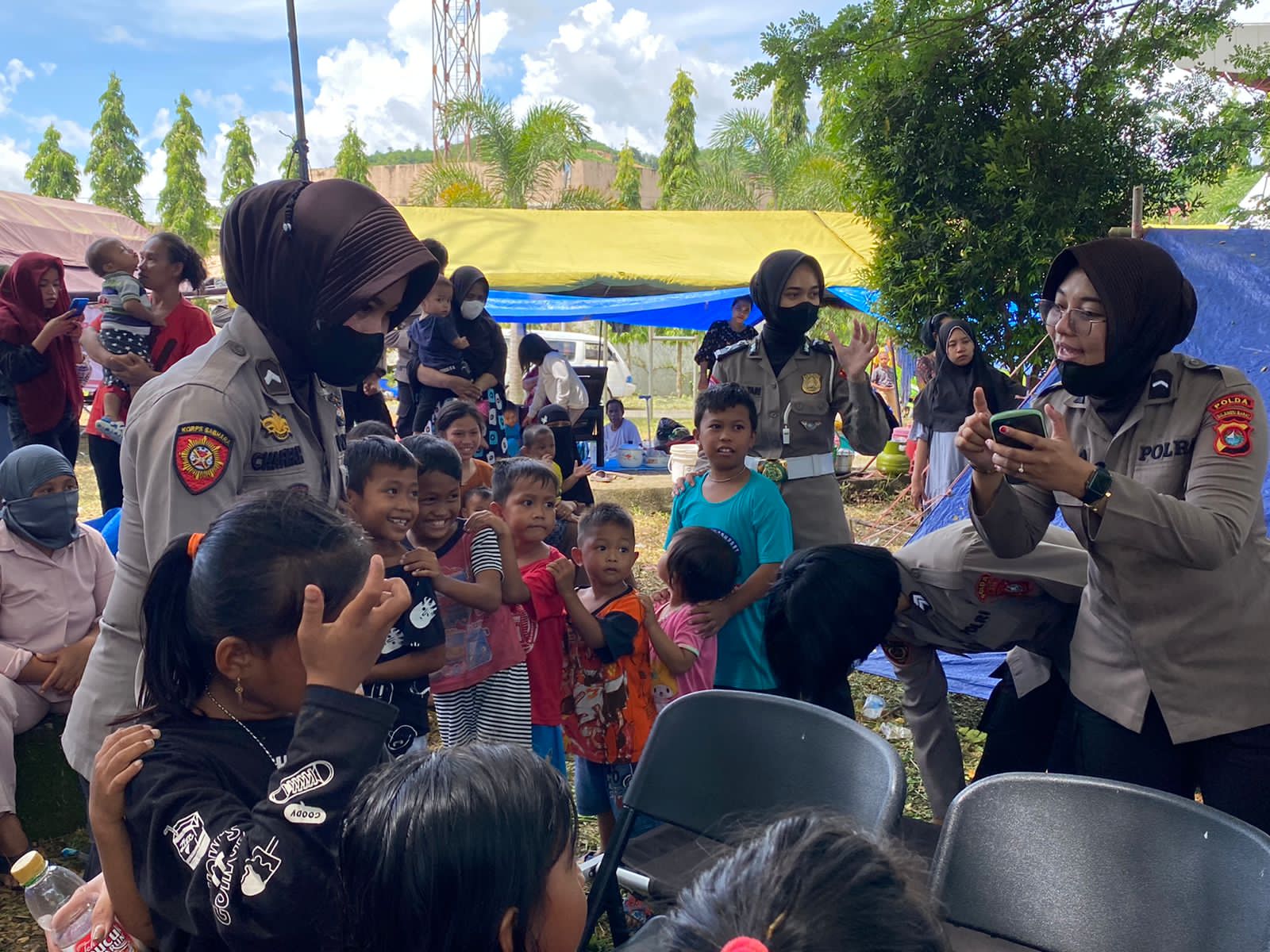 Terlihat Karo SDM bersama Para polwan berbincang bincang, bernyanyi hingga bermain dengan anak-anak di tenda pengungsian.