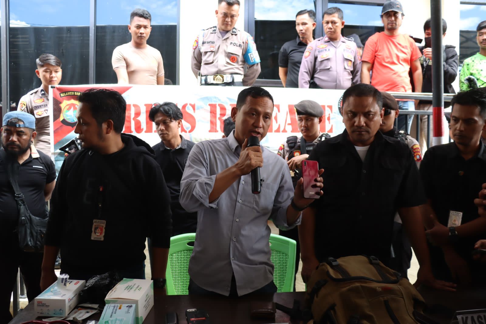 Pres release dipimpin Kasat Reskrim Polresta Mamuju, AKP. Jamaluddin didampingi Kasi Humas IPDA Herman Basir dengan di Hadiri Para awak Media TV, Media cetak dan Media Online.