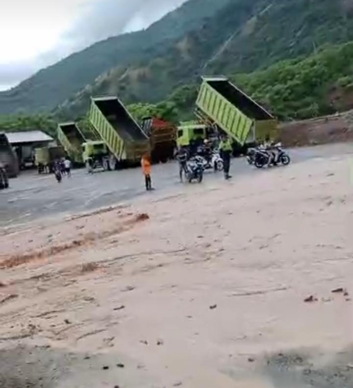 Banjir tersebut mengakibatkan material dibawa arus dan menutupi badan jalan Ruas Palu-Donggala.