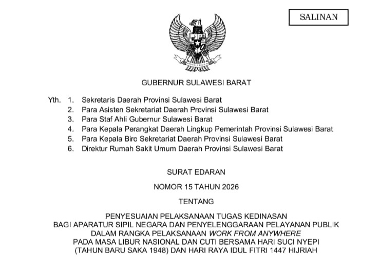 Celebesta.com – MAMUJU, Pemerintah Provinsi Sulawesi Barat menerapkan penyesuaian pelaksanaan tugas kedinasan bagi Aparatur Sipil Negara (ASN) melalui kebijakan Work From Home (WFH) dan Work From Anywhere (WFA) menjelang libur nasional dan cuti bersama Hari Suci Nyepi Tahun Baru Saka 1948 serta Hari Raya Idul Fitri 1447 Hijriah.